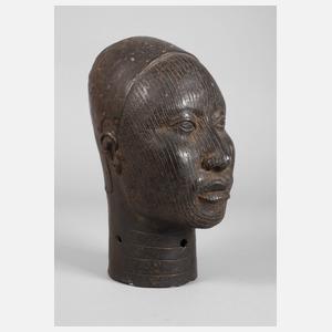 der Volksgruppe der Yoruba zugeordnet, Nigeria, 20. Jh., Bronze gegossen, bräunlich patiniert, im Ife-Stil gefertigtes Kopfstück eines Königs, mit vertikalen Skarifikationen bedeckt, der Mund mit vollen Lippen gerahmt von mehreren gebohrten Löchern, die die Befestigung des Kopfes auf einer Holzpuppe durch Zapfen ermöglichen, leichte Altersspuren, H ca. 26 cm.
