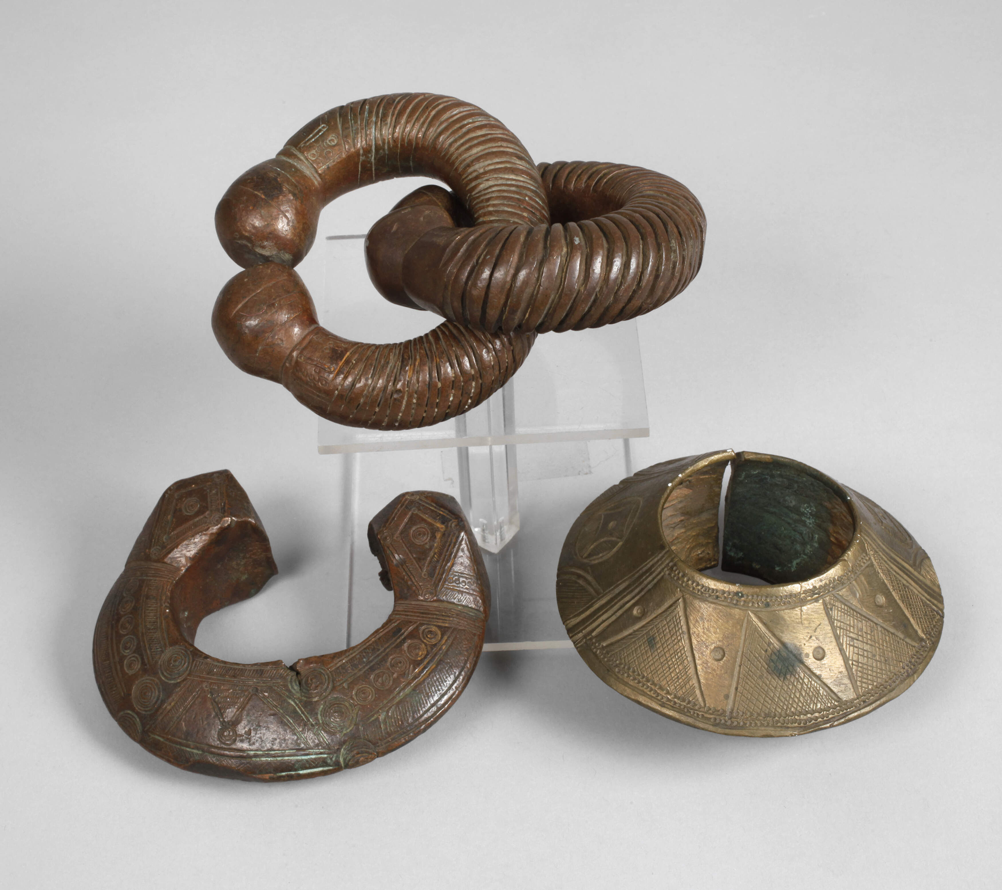 Westafrika, 19./20. Jh., Bronze bräunlich bzw. grünlich patiniert, Primitivgeld in verschiedener Form, wuchtige Modelle, teils aufwendig ornamental verziert, Altersspuren, L max. 14 cm.