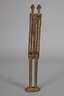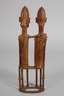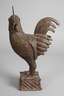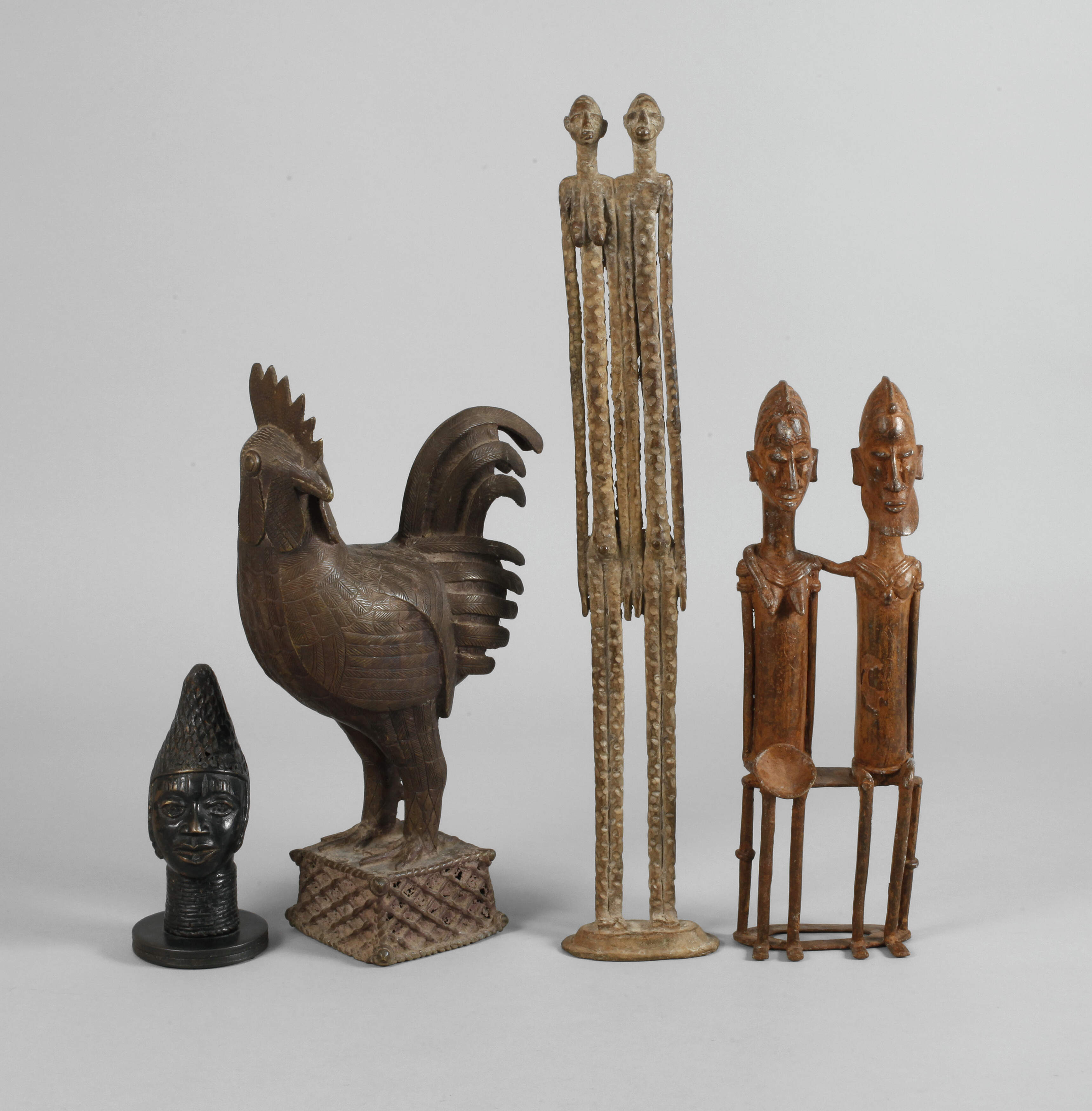 20. Jh., Bronze gegossen, teils dunkel patiniert, nach traditionellem Vorbild gefertigtes Kopfstück, dazu plastisch gearbeiteter Hahn auf Sockel in Flechtoptik, dazu zwei Paardarstellungen in teils stark abstrahierender Formensprache, unterschiedliche Maße und Erhaltungen, H max. 51 cm.