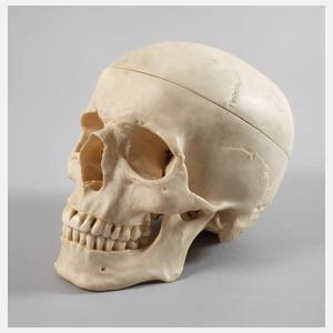 20. Jh., heller Kunstguss, mehrteilig gefertigt und montiert, humanoider Schädel mit geteilter Schädeldecke und abnehmbarer Kalotte, das Kiefergelenk mittels Federn aufgehängt, sehr guter Zustand, H 23 cm.