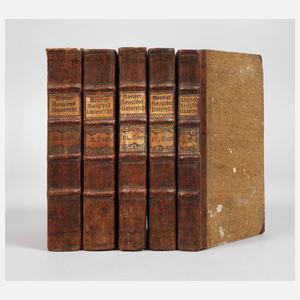 ein Unterrichtsbuch für die Jugend und Lesebuch für das Volk, allen Seelsorgern, Lehrern und Hausfamilien gewidmet, von Franz Andre Roemer, Weltpriester, Band I–V, München bey Johann Baptist Strobel 1786, Format 8°, 551 S., 584 S., 585–1026 S., XXXVI und 44 S., S. 441–776 S., Band I mit Kupferfrontispiz, Rotschnitte, Halbledereinbände der Zeit mit montierten Rückenbezeichnungen, je mit Exlibris auf Deckelrückseite, im Vorsatz handschriftliche Besitzervermerke, die letzten Seiten von Band III wasserrandig, sonst normale Alters- und Studierspuren.