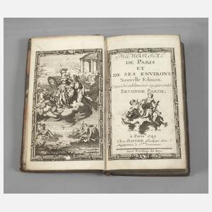 et de ses environs, nouvelle edition considérablement augmentée, seconde partie, à Paris 1749, chez Bauche [...], Format Kl. 8°, marmoriertes Vorsatzpapier, 1 leeres Bl., Frontispiz und gestochener Titelkupfer, XXXVI/293 S. und 2 Bl., Ganzledereinband der Zeit mit goldgeprägtem Rücken und appliziertem Titelschild, Rücken mit kleiner Fehlstelle am Kapital, Ecken etwas bestoßen, handschriftliche Widmung in Tinte, innen, sonst fest und vorwiegend ordentlich erhalten.