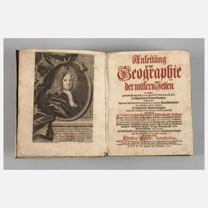 in welcher zuvörderst zu der Cultur der Historiae Medii Aeui, in allgemeinen Anmerckungen sodann aber von der Geographia Medii Aeui in Specie Teutschlandes aus historischen Grundsätzen in besondern Anmerckungen nach dero classibus periodorum deutlich gehandelt und endlich die Nahmen der Alten Teutschen Völcker creysse Wälder Berge [...], betrachtet werden, also verfasset durch Christian Juncker Dresdenden Hochfl. G. Ges. Historiographum [...], Jena bey Johann Felix Bielcken 1712, Format 8°, Kupferfrontispiz mit Portraitdarstellung des Autors, zweifarbig gedrucktes Titelblatt, 10 Bl., 464 S., 46 Bl., im Pergamenteinband der Zeit, mit verblichener handschriftlicher Rückenbezeichnung, innen fest, vorwiegend sauber, normale Alters- und Studierspuren.