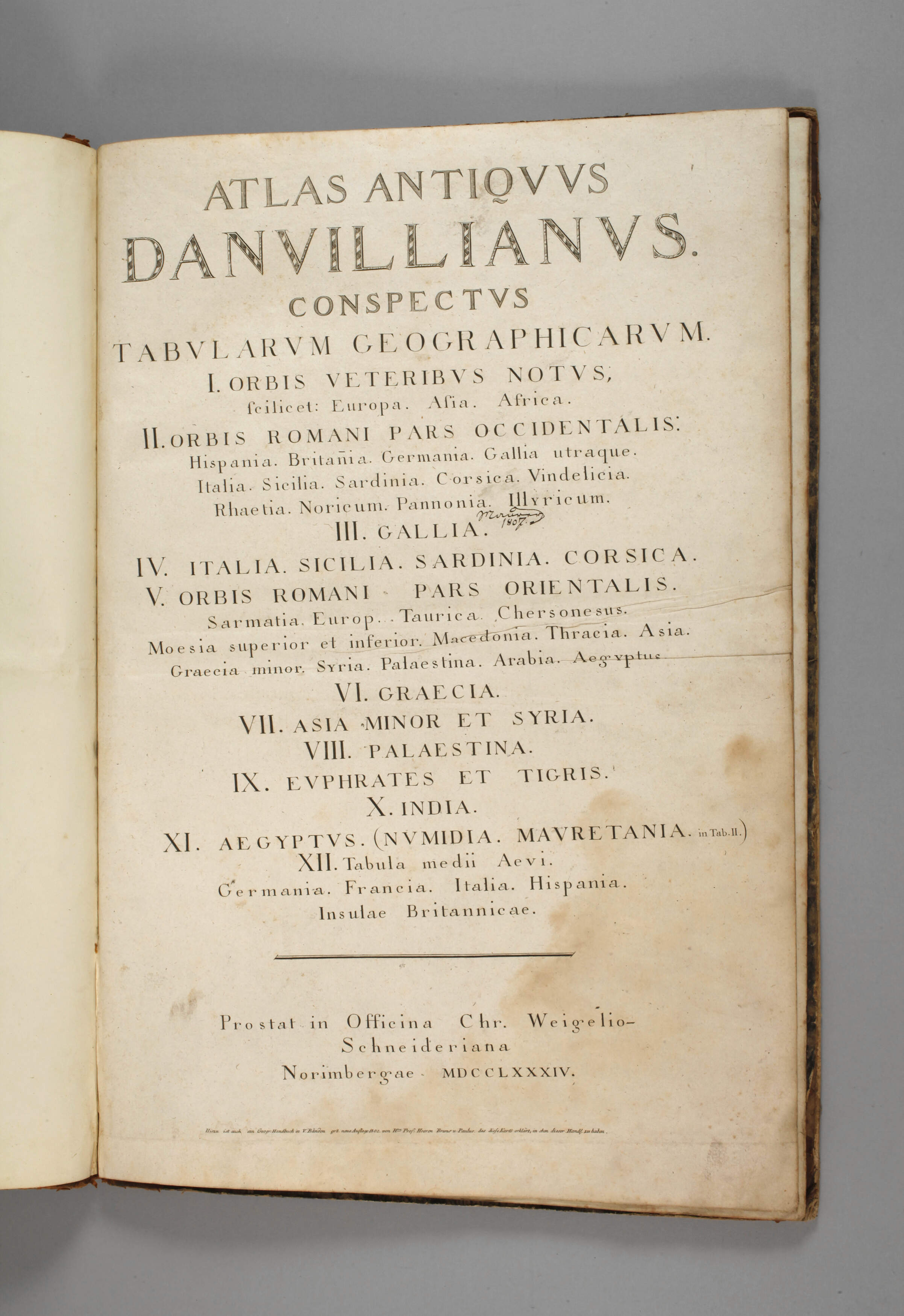Conspectus Tabularum Geographicarum [...], Prostat in officina Chr. Weigelio-Schneideriana Norimbergae 1784, Format Fol., mit 11 doppelblattgroßen und einer ganzseitigen colorierten Kupferstichkarte der Gebiete Europa, Asien, Afrika, der westliche Teil der römischen Welt mit Spanien, Großbritannien, Deutschland, Frankreich usw., Italien, der östliche Teil der römischen Welt mit Palästina, Arabien, Ägypten sowie Griechenland und Indien, in Halbledereinband der Zeit mit Pappdeckel, Einband restaurierungsbedürftig, innen etwas wasserrandig, Ränder gebräunt, Studierspuren.
