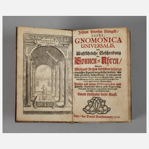 oder ausführliche Beschreibung der Sonnen-Uhren, worinnen allerhand Arthen der hierzu dienlichen Figuren vorgestellet werden, [...], anjetzo mit neuen Observationibus und Figuren, von Johann Peterson Stengels [...] vermehret von einem Liebhaber dieser Kunst, Ulm bey Daniel Bartholomae 1712, Format Kl. 8°, Kupferfrontispiz, zweifarbig gedrucktes Titelblatt, 338 S., 6 Bl. Register sowie insgesamt 110 Kupfertafeln mit schematischen Abbildungen von Sonnenuhren, Halbpergamenteinband der Zeit mit handschriftlicher Rückenbezeichnung, Pappdeckel, Buchblock gebrochen, stellenweise gering fleckig und wenige Blätter mit Randläsuren, Einband restaurierungsbedürftig, selten.