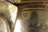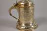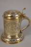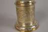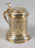 2. Hälfte 17. Jh., Silber gestempelt mit alter Beschaupunze der Stadt Berlin (um 1659 bis Mitte 18. Jh. nachgewiesen), undeutliche Meistermarke, wohl Christoph Knorr(e), Churfürstlicher Hofgoldarbeiter, vergoldet, Humpen mit zylindrischer Wandung, weit ausgestellter gewölbter Fuß, hohl gearbeiteter geschwungener Henkel mit Wappenabschluss, gegabelte Daumenrast mit Volutenabschluss, gewölbter, oben getreppter Klappdeckel, rückseitig scharniert, im Deckel und im Fuß 14 kleine Silbermünzen zu drei Groschen Polen, Sigismund III., um 1600, sowie ein Taler Tirol, Leopold V., 1630, und ein Taler Sigismund III. von Norwegen und Dänemark, 1628 eingelassen, Wandung umlaufend graviert mit Rollwerk und Putten sowie drei Kartuschen mit Schriftzügen "Nonvi" (Gewaltlosigkeit), "Patientia" (Geduld) und "Solertia" (Geschicklichkeit/Klugheit), darin die passenden allegorischen Figuren in Landschaft, die Darstellungen gehen auf den in Straßburg tätigen Stecher Etienne Delaune zurück, der sie ursprünglich als die zu dieser Zeit bekannten vier Kontinente Afrika, Europa und Asia (und Amerika, hier aber nicht dargestellt) entwarf, diese Motive wurden im 16. und 17. Jahrhundert insbesondere von Zinngießern weiter verwendet und in der hier gezeigten Form auch auf der sogenannten Temperantia-Schüssel von François Briot (1550-1616) verwendet, restauriert, H ca. 15,9 cm, G ca. 495 g. Quelle: Hans Demiani (1897), François Briot, Caspar Enderlein und das Edelzinn. Leipzig; Julius Lessing, Edelzinn, in Prof. Karl Hoffacker, Kunstgewerbeblatt, Neunter Jahrgang, Verlag von Seemann & Co., Leipzig 1898, S. 52 b ff.. Info: In Berlin sind die Aufzeichnungen zu Goldschmieden und Punzen in dieser Zeit durch einen regen Zustrom neuer Gold- und Silberschmiede schwer nachzuvollziehen, viele Punzen sind nicht mehr zu belegen, die Datierungen lassen sich jedoch anhand von Kirchenbüchern rekonstruieren, zu einer Tochter Knorres ist vermerkt, dass die Kurfürstin und der Kurprinz zur Taufe Paten gestanden haben, Knorre selbst ist als Pate einer Tochter des Goldschmieds Quippe im Jahr 1702 vermerkt, das Patent als Hof-Goldarbeiter Knorres wurde 1710 vergeben. Quelle: Friedrich Sarre, Die Berliner Goldschmiedezunft von ihrem Entstehen bis zum Jahre 1800 - Ein Beitrag zur Kunst- und Gewerbe-Geschichte Berlins; Wolfgang Scheffler, Berliner Goldschmiede. Daten, Werke, Zeichen, Verlag Bruno Hessling, Berlin 1968.