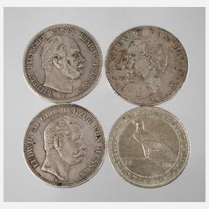 5 Mark Preußen 1875 B, Wilhelm I., ss+; 5 Mark Bayern 1902 D, Otto von Bayern, vz mit Patina; 5 Mark Hessen 1876 H, Ludwig III., vz, Revers leicht fleckig, sowie 5 Mark 1930 A, Räumung des Rheinlandes, vz.