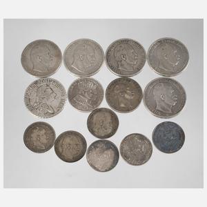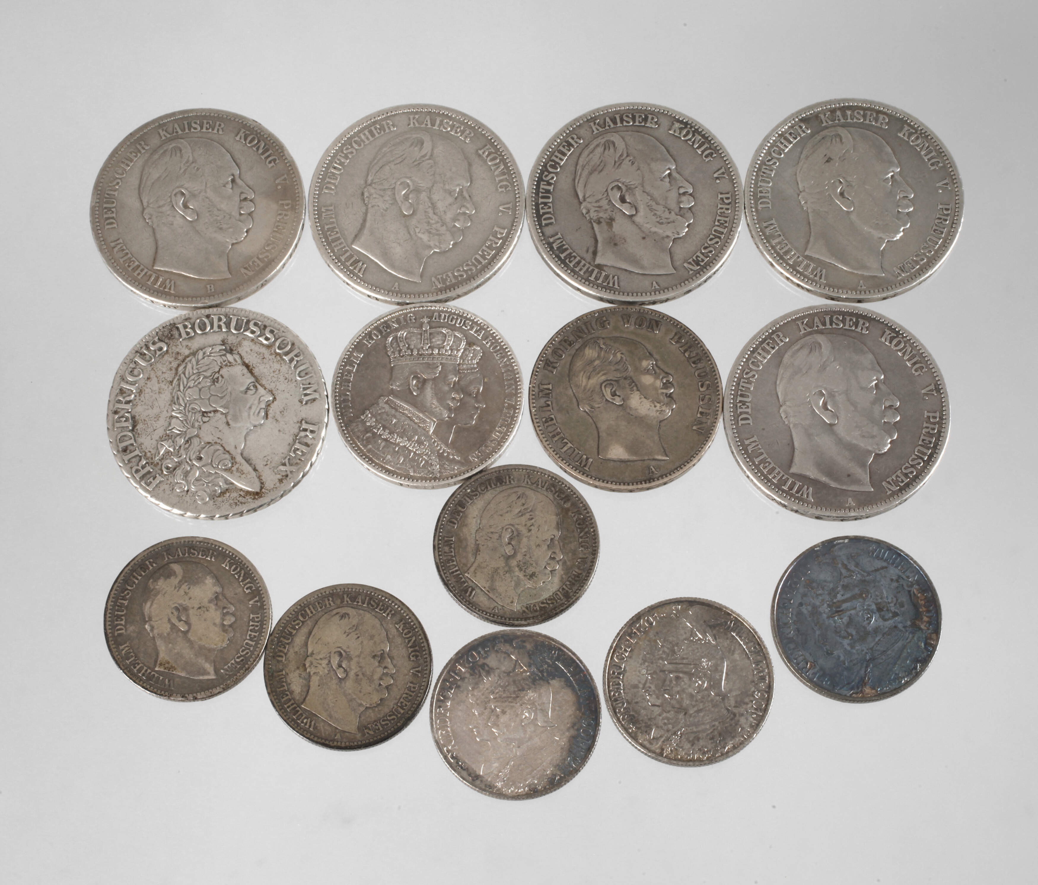 1 Taler 1777 A, Friedrich der Große, ss+; Krönungstaler 1861, Wilhelm I. und Augusta, vz; Vereinstaler 1861, Wilhelm I., ss; viermal 5 Mark 1876 A, Wilhelm I., ss+; 5 Mark 1876 B, Wilhelm I., ss+; zweimal 2 Mark 1876 A, Wilhelm I., ss; 2 Mark 1876 C, Wilhelm I., ss, sowie dreimal 2 Mark 200 Jahre Preußen 1901, vz, davon einmal mit Patina.