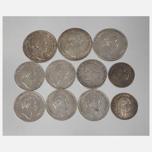 Vereinstaler 1862 B, Avers Johann von Sachsen, Revers das sächsische Wappen, von zwei Löwen gehalten und mit Umschrift "Ein Vereinsthaler, XXX ein Pfund fein", vz; dreimal 5 Mark Friedrich August, 1907 E, ss+, 1908 E, vz und 1914 E, vz; fünfmal 3 Mark Friedrich August 1909 E bis 1912 E, ss+ bis vz; 2 Mark 1904 E, auf den Tod von König Georg, vz, sowie 2 Mark 1902 E, auf den Tod von König Albert, vz.