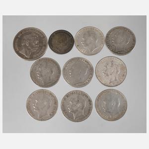 5 Mark Hessen 1875 H, Ludwig III., ss+; 2 Mark Hessen 1877 H, Ludwig III., s–ss, dazu achtmal 3 Mark Baden 1908 G, 1912 G, Friedrich II., ss–vz.