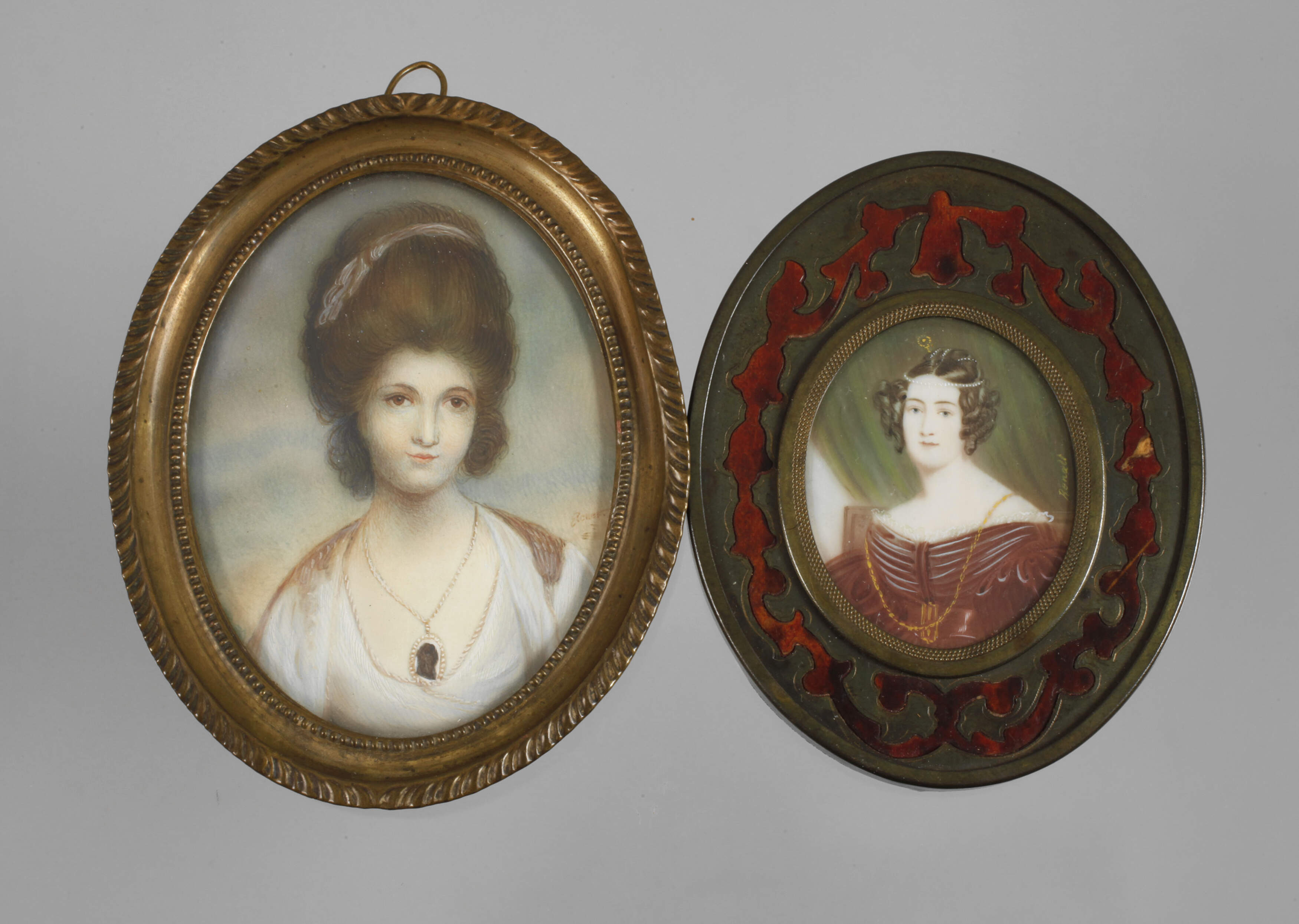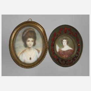 Anfang 20. Jh., eins signiert Renalt und rückseitig undeutlich annotiert, Gouache auf Platte, feine Darstellung zweier junger Schönheiten, darunter Kopie nach Karl Joseph Stielers Bildnis der Irene Markgräfin Pallavicini sowie Schulterstück einer Rokokograzie vor monochromem Fond, beide in Messing hinter Glas gefasst, leichte Altersspuren, Maße max. 10 x 8,5 cm.