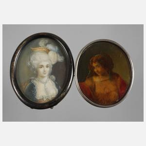 19./20. Jh., unsigniert, Gouache auf Platte, feine Darstellung zweier junger Schönheiten im Interieur, beide in Silberrahmen hinter Glas gefasst, leichte Altersspuren, Maße max. 8 x 6,5 cm.