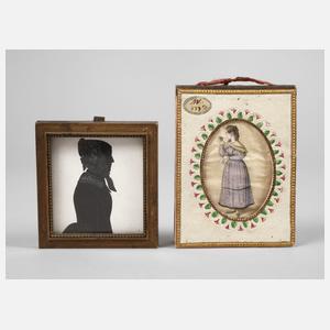 1. Hälfte 19. Jh., undeutlich handschriftlich annotiert, Schattenriss mit Weißhöhung, Gouache auf Papier, Halbfigurenbildnis einer Dame im Profil mit betontem und detailhaft herausgearbeiteten Spitzenkragen und Haube, hinter Glas in schmaler Leiste gefasst, dazu vierseitiges Leporello, Gouache auf Seide, mit vier ganzfigurigen Darstellungen mit Stationen des Ehelebens aus weiblicher Sicht, in geprägtem Pappetui, leichte Altersspuren, Maße 7,5 x 7 cm und 9 x 7,5 cm.
