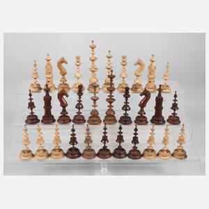 19. Jh., gedrechselte Spielfiguren aus Laubholz, teils dunkel gefasst, filigran gearbeitet, nicht ganz komplett, Altersspuren, H König 11 cm.