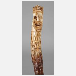 20. Jh., Knotenstock mit figürlich gearbeitetem Griffstück aus beschnitztem Hirschhorn, in Form eines bekrönten Hauptes als Januskopf, welches einerseits als Totenschädel und andererseits als alterndes Gesicht dargestellt ist, Metallzwinge, leichte Gebrauchsspuren, H 125 cm.