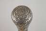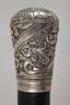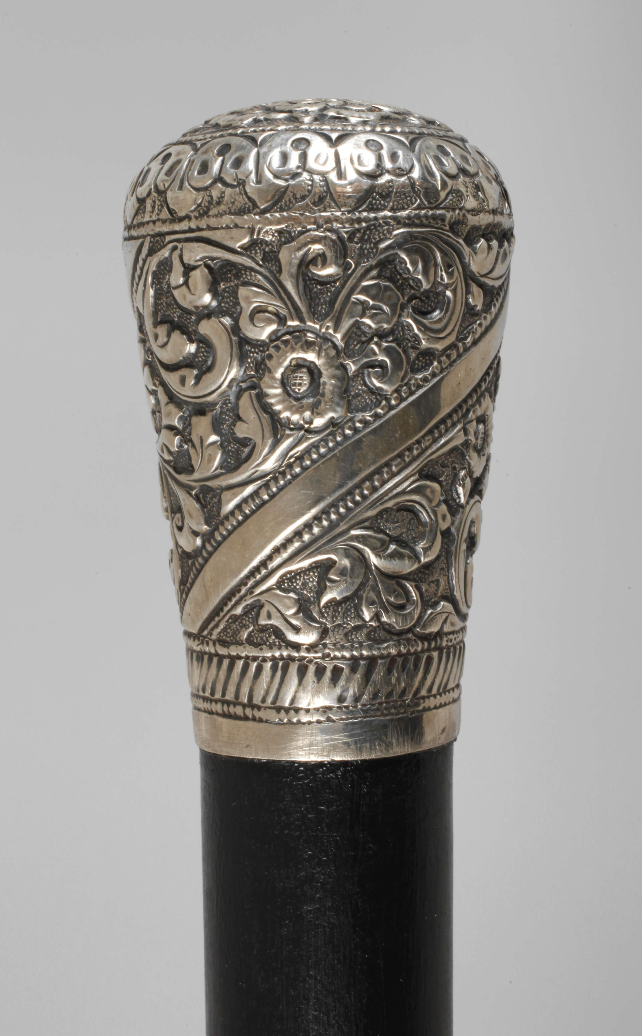 um 1900, konisch zulaufender Knauf reich ornamental reliefiert, ungemarkt, geprüft, ebonisierter Schuss aus Hartholz, Hornzwinge, guter Zustand, H 90 cm.