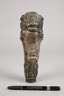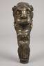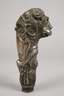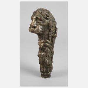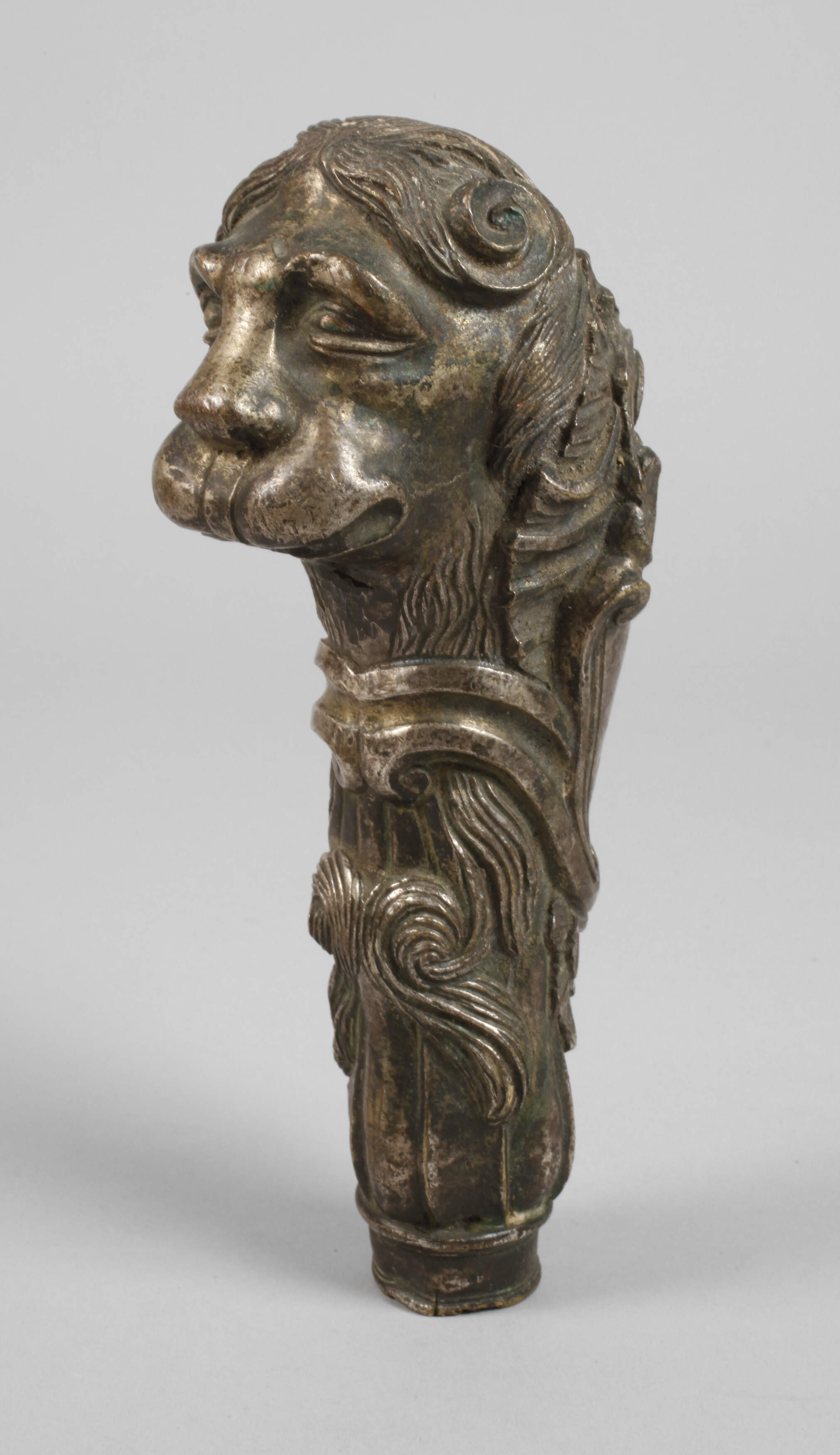 18. Jh., Bronze massiv und versilbert, figürliches Zierelement eines stilisierten Löwenhauptes, gesäumt von Rocaillen und Rollwerk, kleine Fehlstelle, Alters- und Korrosionsspuren, H 21,5 cm.