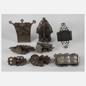 16. bis 18. Jh., dabei prächtiges gotisches Truhenschloss mit reich verzierter Schlossplatte, Zangenschloss mit Schlüssel, möglicherweise Niederlande oder England, funktionstüchtig, ein großes Renaissance-Türschloss, die Schlossplatte mit stilisierter Schlange verziert, diese mit Zunge aus Kupferblech, ungewöhnliche Mechanik, ebenso funktionstüchtig, mit Schlüssel, weiterhin fünf barocke Schrankschlösser, davon zwei mit Schlüssel, sowie ein spätbarockes Kastenschloss, L von 20 cm bis 31 cm, aus einer süddeutschen Privatsammlung.
