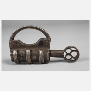 17. Jh., Eisen geschmiedet, zylindrischer Korpus, mit drei Bändern verziert, funktionstüchtig, L 7,5 cm, aus einer süddeutschen Privatsammlung.