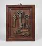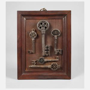 wohl Nürnberg, 17. Jh., Konvolut aus fünf Buntbartschlüsseln, Schmiedeeisen, unterschiedliche Modelle mit dekorativen Reiten in Maßwerkoptik, nachträglich montiert und gerahmt, Altersspuren, Gesamtmaße 28 x 22 cm.