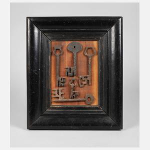 wohl 15. Jh., Konvolut aus fünf Buntbartschlüsseln, Schmiedeeisen, unterschiedliche Modelle mit schlichten Reiten, starke Korrosionsspuren, nachträglich montiert und gerahmt, Altersspuren, Gesamtmaße 34 x 30 cm.