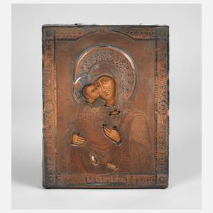 Russland, 20. Jh., kirchenslawisch bezeichnet, Tempera über Kreidegrund auf Laubholzplatte, aufwendig getriebenes, aus einem Stück gefertigtes Risa aus Kupferblech, teils versilbert bzw. geschwärzt, fein punziert und mit Floralelementen verziert, mehrfach gepunzt, Darstellung Mariens im Typus der Gottesmutter von Vladimir, welche Maria mit dem Christusknaben auf dem rechten Arm zeigt, die Gesichter der beiden einander innig zugeneigt, Altersspuren, berieben, Maße 22 x 18 cm.