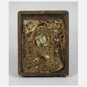 wohl 19. Jh., ungemarkt, Tempera auf Platte, Marienbildnis im Typus der Gottesmutter von Wladimir, die Maria in inniger Beziehung zum Christusknaben zeigt und damit die beiden klassischen Darstellungstypen der Eleusa und Hodegetria vereint, getriebenes Messingoklad, aufwendig punziert, hinter Glas in Nadelholz gefasst, starke Erhaltungsmängel, restaurierungsbedürftig, Maße 31 x 24 cm.