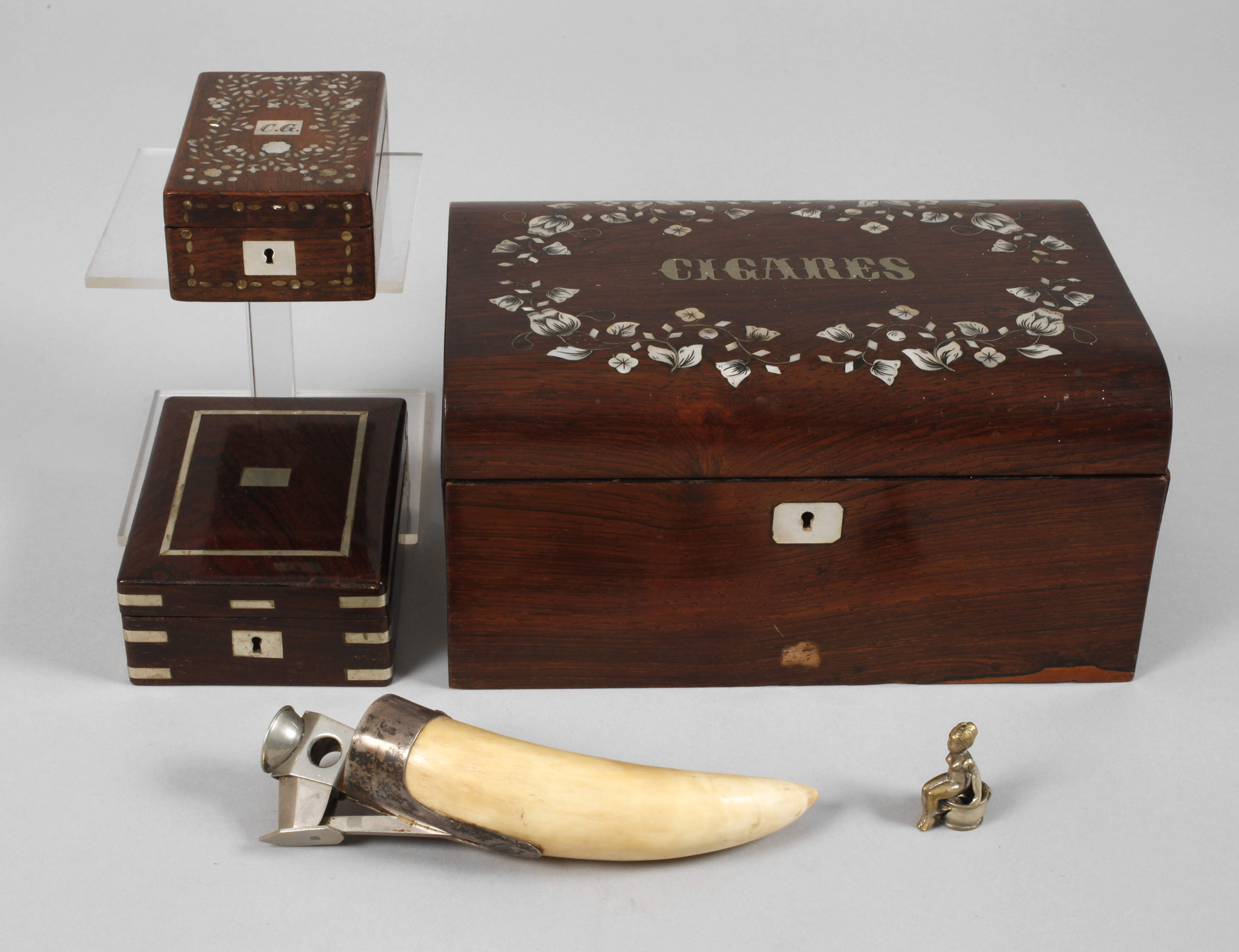 Anfang 20. Jh., dabei drei Tabakdosen aus dunklem Edelholz mit floralen und ornamentalen Einlagen aus Perlmutt, Zinn und Kupferdraht, eine mit Besitzermonogramm CG, eine andere mit Umschrift Cigares, dazu Zigarrenabschneider aus Walrosszahn mit versilberter Metallmontierung, Alters- und Gebrauchsspuren, Maße max. 11 x 21 x 14 cm.
