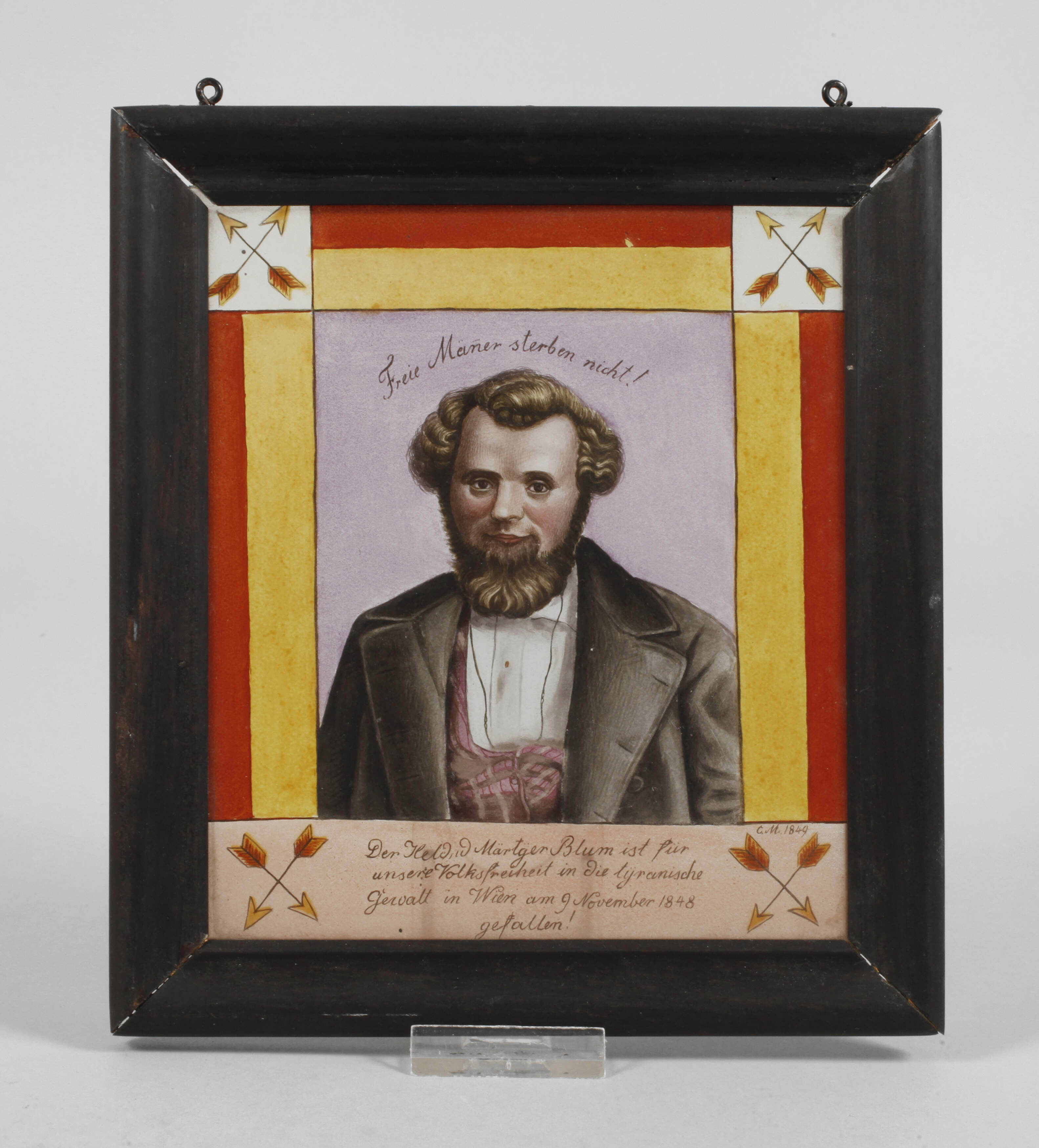 monogrammiert C.M. und datiert 1849, bezeichnet "Freie Männer sterben nicht!" und "Der Held und Märtyrer Blum ist für unsere Volksfreiheit in die tyrannische Gewalt in Wien am 9. November 1948 gefallen!", Klarglas farbig gefasst, zentrales Brustbild des deutschen Politikers und Freiheitskämpfers, gerahmt von Bordüren und gekreuzten Pfeilen, in geschwärzte Holzleiste gefasst, minimale Altersspuren, Maße 20 x 18 cm.