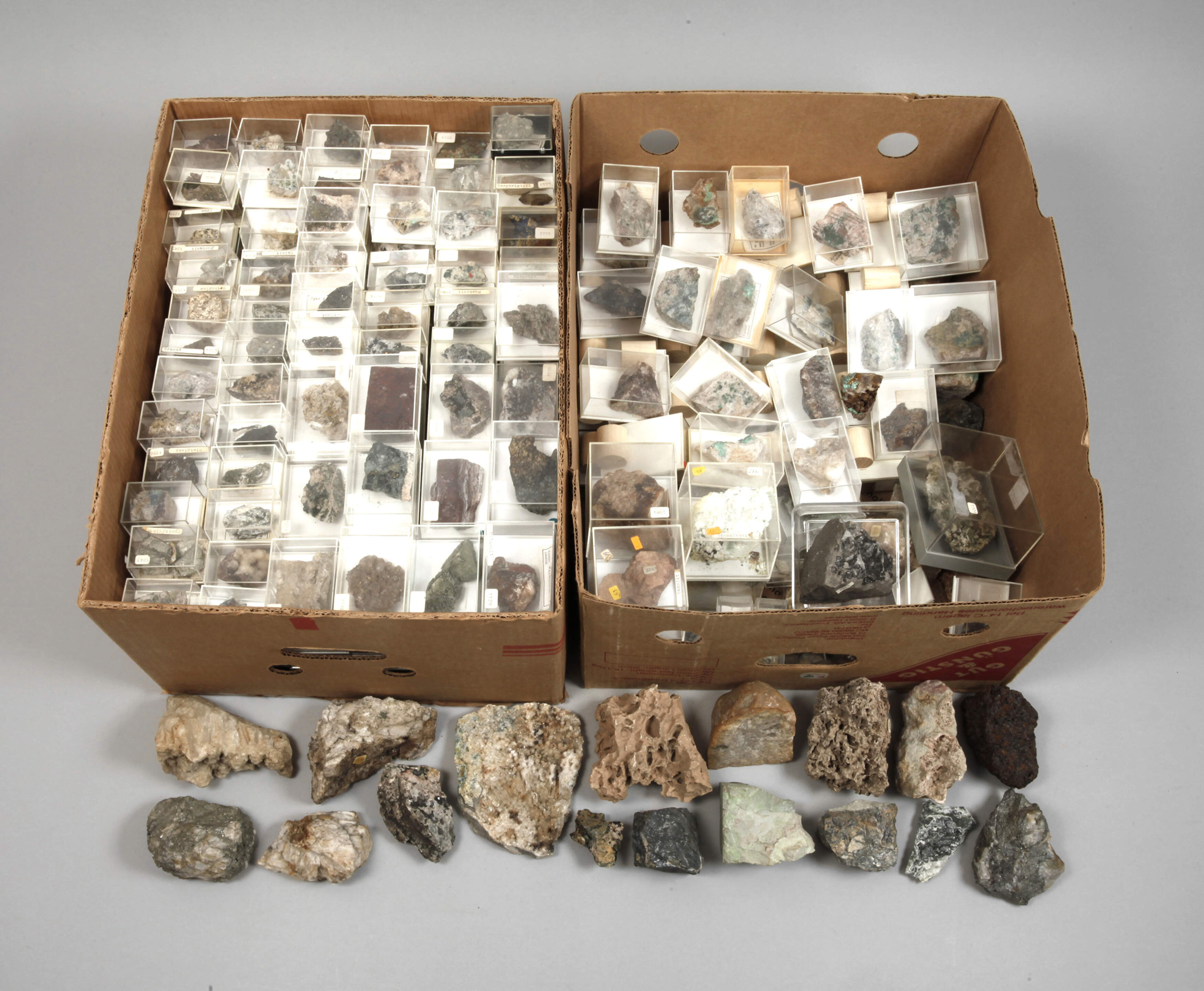 geschätzt ca. 200 meist in Dosen montierte Mineralstufen der Fundpunkte Niederbeerbach und Raidelbach, vorwiegend Kupfer- und Eisenminerale, größtenteils beschriftet, Funde der 1970er und 1980er Jahre, beigegeben Kiste von weiteren Stufen.