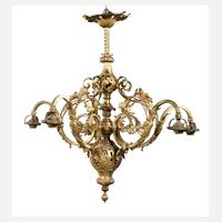 Ende 19. Jh., im Rokokostil gefertigtes Modell mit zentralem Balusterschaft aus Bronze, teils durchbrochen gearbeitet mit Gitterdekor, Rocaillen und Floralismen, umlaufend fünf in Volutenform gestaltete Leuchterarme mit je einer abgehängten Lampenfassung, Alters- und Korrosionsspuren, H ca. 80 cm, D ca. 65 cm.