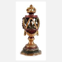 wohl 18. Jh., Holz geschnitzt, gestuckt, mehrfarbig gefasst und goldbronziert, in Form eines Leuchters gestaltet, teils durchbrochen gearbeitet, minimale Substanzverluste, Altersspuren, H 25 cm.