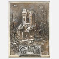 im dichten, leicht verschneiten Wald auf einem Felssporn thronendes Märchenschloss mit um Einlass bittendem Weihnachtsmann, im Vordergrund umgestürzter Baum und das Geschehen beobachtender Hirsch, im unteren Bereich der Darstellung Relief mit thronender Maria, flankiert von betenden Rittern, Mischtechnik (Graphit, Deckweiß und Tusche) auf Karton, rechts unten signiert und datiert "H. Vogel (19)15", auf der Rahmenrückwand bezeichnet "Original 1915/Märchenwald-Heiligenacht/v. Hermann Vogel, Krebes/Vogtl." sowie "Als Geschenk von Frau Marie Hendel anläßlich Ihres Wegzuges nach der Schweiz erhalten Rudolf Riedl" sowie in Blei wohl vom Künstler "H. Vogel/Heilige Nacht/19. Nov. 1915", minimale Altersspuren, hinter Glas gerahmt, Falzmaße ca. 33 x 25,5 cm. Künstlerinfo: auch genannt "Hermann Vogel-Plauen", dt. Zeichner, Illustrator und Malerpoet (1854 Plauen bis 1921 Krebes), gefördert durch seinen kunstsinnigen Vater Wilhelm Traugott Vogel, 1873 kurzzeitig Jurastudium in Leipzig, studierte Ostern 1874 kurzzeitig an der Dresdner Akademie, autodidaktisch weitergebildet, 1877–78 Studienreise nach Italien (Rom), schuf zahlreiche Illustrationen, unter anderem für den Verlag Braun & Schneider München unter anderem für die Zeitschrift "Fliegende Blätter", 1909 Ernennung zum Professor, Gründungsmitglied der "Deutschen Künstlergesellschaft", Mitglied im Verband Deutscher Illustratoren und in der Allgemeinen Deutschen Kunstgenossenschaft, beschickte unter anderem die Große Berliner Kunstausstellung, tätig in Plauen, später in Dresden-Loschwitz und Krebes bei Gutenfürst im Vogtland, Quelle: Thieme-Becker, Frank Weiß "Malerei im Vogtland", Matrikel der Akademie Dresden, Boetticher, Dressler, Müller-Singer und Wikipedia.