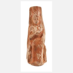 19./20. Jh., unsigniert, Terrakotta in roter Farbfassung, sitzende weibliche Darstellung der archaischen griechischen, sogenannte dädalische Sitzstatuette, ähnliche Skulpturen finden sich auf der Webseite des griechischen Nationalarchivs Kultur (z.B. mit Delphi Archaeological Museum Index 16957) sowie auf der Webseite des MET Museum (mit Nr. 1972.118.123), allen Figuren ist gemein, dass sie mit Chiton, Himation und Stephane auf einer thronartigen Sitzgelegenheit in Frontalansicht dargestellt sind, einige haben, wie die vorliegende Skulptur, eine Hand zu Brust erhoben, die Darstellung war um 500–400 vor Chr. üblich, solcherlei Skulpturen dienten wohl unter anderem als Grabbeigaben, Farbfassung stärker in Mitleidenschaft gezogen, H 14 cm.