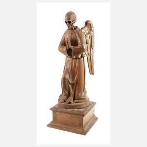 19. Jh., Laubholz massiv, beschnitzt, bräunlich gefasst, Todesengel, vollplastisch gestaltete kniende Engelsgestalt mit Flügeln als Knochenmann, Altersspuren, minimale Substanzverluste, H 64 cm.
