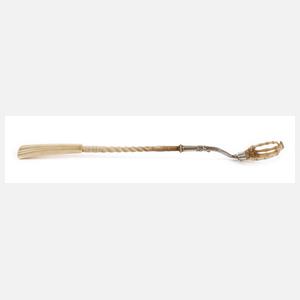 1. Hälfte 19. Jh., Silber gestempelt 13 Lot, Knochen beschnitzt, teils gedrechselt, gedreht-gerippter Schaft mit fächerartigem Abschluss, getriebene Silbermontierung, Kratzer in Form einer menschlichen Hand, Altersspuren, L 41cm.