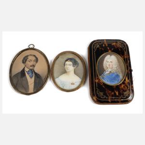 19./20. Jh., eins gemarkt und dat. 1861 Eug. van Matzegham?, Gouache auf Platte, Brustbildnis eines Herren sowie einer jungen goldgeschmückten Dame, dazu lederausgekleidetes Etui aus Schildpatt mit eingelegtem Bildnis eines barocken Edelmanns, gerahmt von Einlegearbeiten, rückseitig graviertes Monogramm DB, trocknungsrissig, sonst normale Alters- und Gebrauchsspuren, L max. 14 cm.