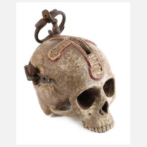 19. Jh., Holz geschnitzt, kreidegrundiert, farbig gefasst und partiell goldbronziert, makabre Kollekte an massivem geschmiedeten Ring, in Form eines Totenschädels gestalteter Korpus mit scharniertem Deckel, der Münzweinwurf in Kreuzform gearbeitet, Altersspuren, H 25 cm.