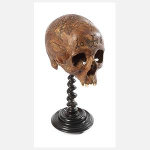 datiert 1667, menschliche Schädelkalotte mit Resten des Zahnbesatzes, das Dach graviert mit Pentagramm und Illuminaten-/Freimaurersymbolik, zusätzlich Sonnenmotiv, auf dunkel gefasstem, gedreht geripptem Holzfuß montiert, Erhaltungsmängel, H 34 cm.
