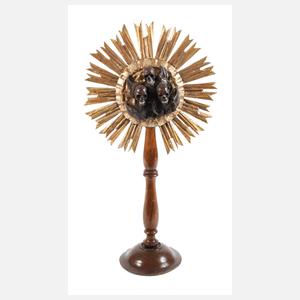 19./20. Jh., in Form einer Monstranz gestaltetes Zierobjekt mit gedrechseltem Holzfuß und vergoldetem Strahlenkranz, im Zentrum plastisch gearbeiteter Schwebeengel mit Totenschädel, kleinere Substanzverluste, H 56 cm.