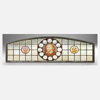 um 1880, Oberlicht mit Stichbogen, mittig fein gemaltes Portrait von William Shakespeare, von Butzenscheiben gerahmt, in späterem Metallrahmen mit Aufhängung, H 46 x B 140 cm.