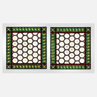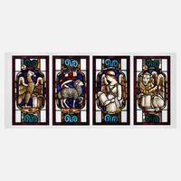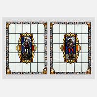 um 1900, passend zur vorhergehenden Position, aus Farb- und Ornamentglas, teilweise bemalt, in brauner Holzleiste gerahmt, Altersspuren, je H 99 x B 41 cm.