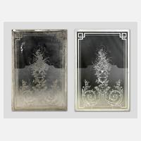um 1890, übergroße Glasscheiben mit sehr fein geätztem Dekor im Rokokostil, mit Blumen und Gräsern geschmückte Amphorenvase auf mit Voluten verziertem Podest, eine Scheibe im originalen Holzrahmen, geringe Farbreste, sonst guter Zustand, IM 143 x 94 cm.