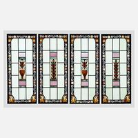 um 1910, Farb- und Ornamentglas mit stilisiertem Floralmotiv, vereinzelte Scheiben mit Riss, H 53 x B 25 cm, H 80 x B 25 und H 80 x B 52 cm.