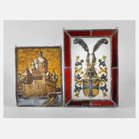 deutsch, um 1890, blasiges Klarglas in polychromer Bemalung, Wappendarstellung und Burganlage, Altersspuren, L 33 und 25 cm.