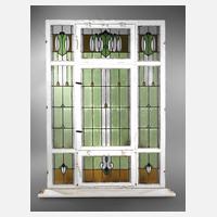 um 1905, stilisiertes Motiv aus Farb- und Ornamentglas, mittig Flügel zum öffnen, darüber und darunter jeweils ein Kippflügel, ein Scheibe mit zwei kleinen Rissen, sonst gute Erhaltung, H 216 x B 150 cm.