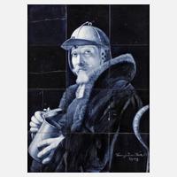 passend zu vorhergehender Position, rechts unten gemarkt vereinigte Servaiswerke AG Ehrang, um 1900, quadratische Fliesen mit kobaltblauer Glasur, sehr fein gemalte Darstellung eines Landsknecht im Pelzmantel mit Bierhumpen, vier Fliesen mit Riss, später gerahmt, IM 59 x 44 cm.