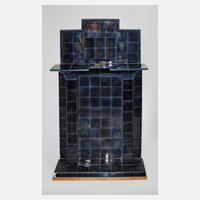 um 1920, gemarkt Meissen Teichert, irisierend nachtblau glasiert, vorspringende Pilaster mit Konsolaufbau, originale, gepflegte Erhaltung mit leichten Alters- und Gebrauchsspuren, ca. zehn Fliesen der Oberkante mit Haarriss, Maße gesamt ca. 200 x 127 x 33 cm.