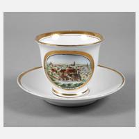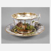 um 1840, Ritzmarke ”N”, vertikal gerippte Tasse mit hochgezogenem abgekanteten Henkel, die Rippen vergoldet, umlaufend polychrom bemalt, sommerliche Berglandschaft mit schauseitiger Burg und Wanderer, orig. Untertasse mit korrespondierendem Dekor, etwas berieben, sonst gute Erhaltung, H 7,5 cm.