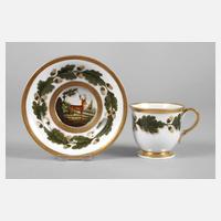 um 1830/40, ungemarkt, glockenförmige Tasse mit ausgestelltem Stand, Ohrenhenkel, Weinlaubdekor in Grün, schwarz konturiert, partielle Vergoldung, passende Untertasse, im Spiegel ein fein gemaltes Hirschmotiv mit Landschaft, im Hintergrund Dorf mit Kirche, gute Erhaltung, H 7 cm.